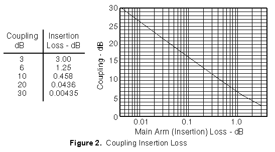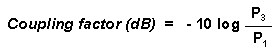 that the coupled response is periodic with frequency. For example, a Common properties desired for all directional couplers are wide operational bandwidth, high directivity, and a good impedance match at all ports when the other ports are terminated in matched loads. These performance characteristics of hybrid or non-hybrid directional couplers are self-explanatory. Some other general characteristics will be discussed below. The coupling factor is defined as: where P1 is the input power at port 1 and P3 is the output power from the coupled port (see Figure 1). The coupling factor represents the primary property of a directional coupler. Coupling is not constant, but varies with frequency. While different designs may reduce the variance, a perfectly flat coupler theoretically cannot be built. Directional couplers are specified in terms of the coupling accuracy at the frequency band center. For example, a 10 dB coupling 0.5 dB means that the directional coupler can have 9.5 dB to 10.5 dB coupling at the frequency band center. The accuracy is due to dimensional tolerances that can be held for the spacing of the two coupled lines. Another coupling specification is frequency sensitivity. A larger frequency sensitivity will allow a larger frequency band of operation. Multiple quarter-wavelength coupling sections are used to obtain wide frequency bandwidth directional couplers. Typically this type of directional coupler is designed to a frequency bandwidth ratio and a maximum coupling ripple within the frequency band. For example a typical 2:1 frequency bandwidth coupler design that produces a 10 dB coupling with a 0.1 dB ripple would, using the previous accuracy specification, be said to have 9.6 0.1 dB to 10.4 0.1 dB of coupling across the frequency range. In an ideal directional coupler, the main line loss port 1 to port 2 (P1 - P2) due to power coupled to the coupled output port is: ![]() The actual directional coupler loss will be a combination of coupling loss, dielectric loss, conductor loss, and VSWR loss. Depending on the frequency range, coupling loss becomes less significant above 15 dB coupling where the other losses constitute the majority of the total loss. A graph of the theoretical insertion loss (dB) vs coupling (dB) for a dissipationless coupler is shown in Figure 2. ![]() Isolation of a directional coupler can be defined as the difference in signal